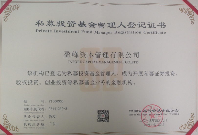 Infore capital was notified by the China securities investment fund association on April 4 and was registered as private investment fund administrator. On April 9, the company officially accepted the certificate of registration issued by the private fund manager of China securities regulatory commission and China securities investment fund industry association in Beijing.