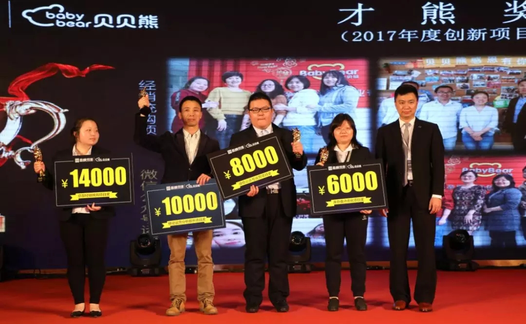 過去的2017年里,公司涌現出一大批優秀管理者及員工,他們在自己的工作崗位上、領域里施展著才能,有著突出的表現。現場對讀書分享會組織—智熊獎;內訓師—博熊獎;促銷員—助熊獎;年度全國十佳育嬰師、十佳泳療師、十佳員工—精熊獎; 店長—棒熊獎;區域經理—帥熊獎;雙品類達成—猛熊獎;創新項目—才熊獎;十項全能分公司—金熊獎在內的十一個大獎,數十位優秀員工進行了表彰。他們是真正的英雄,時間是公平的,唯有加倍努力才能獲得成功。業績導向,以奮斗者為本的激勵模式仍然將是2018年的主旋律!